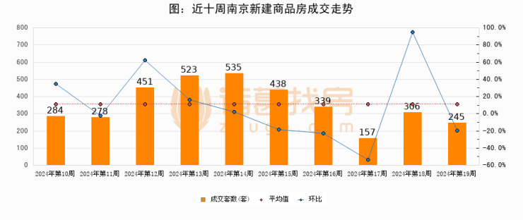 进入2024年第18周(04月29日-05月05日),南京新建商品房成交245套,较上周减少61套,环比下降19.9%