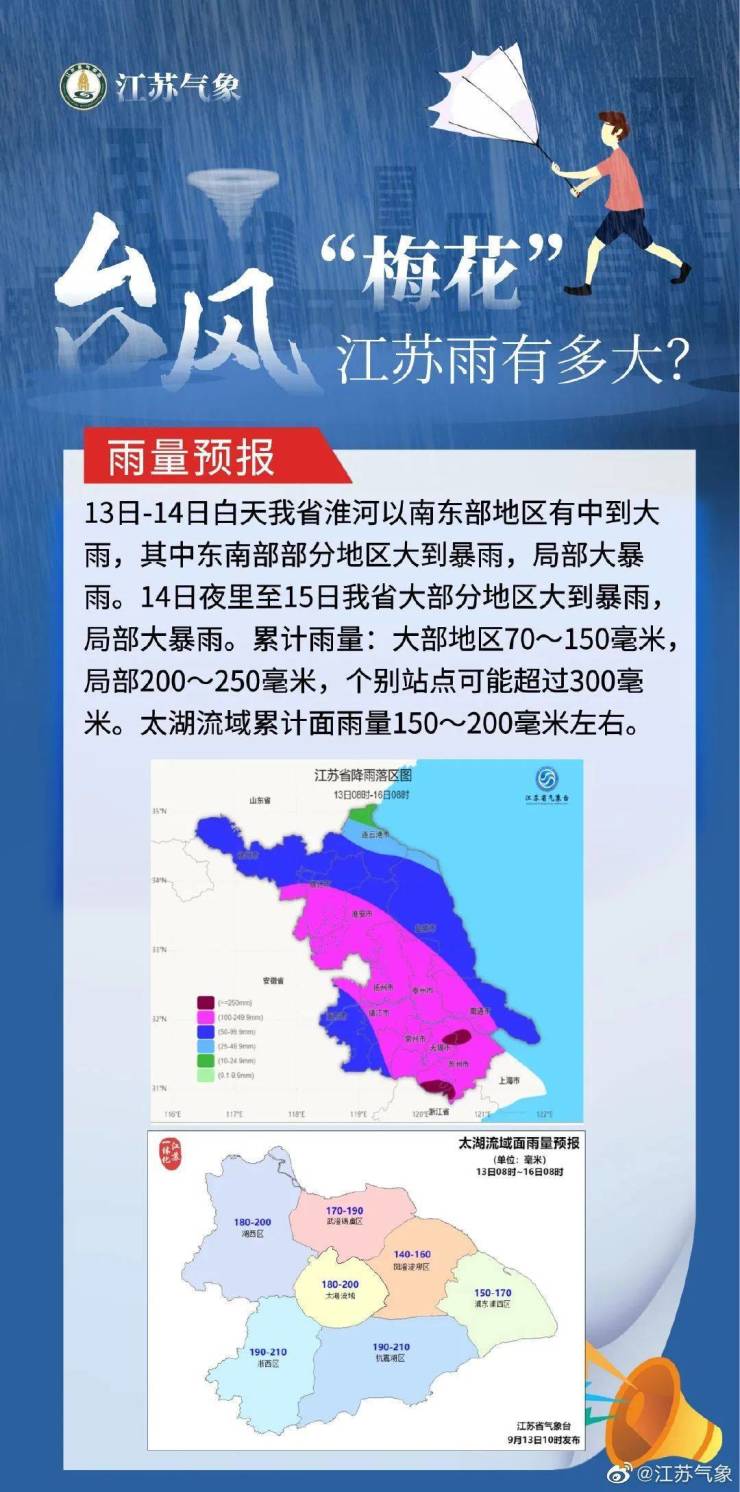 降水预报:9月14日14时至15日14时,辽东半岛、山东中东部、安徽东部、江苏、上海、浙江中北部有大到暴雨,其中,山东半岛南部沿海、江苏东部、上海、浙江东北部等地部分地区有大暴雨,浙江东北部局地特大暴雨(250-280毫米)。