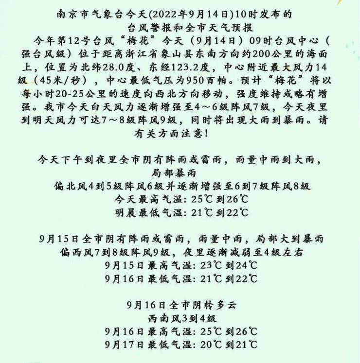 南京市气象台今天(2022年9月14日)10时发布的台风警报和全市天气预报: