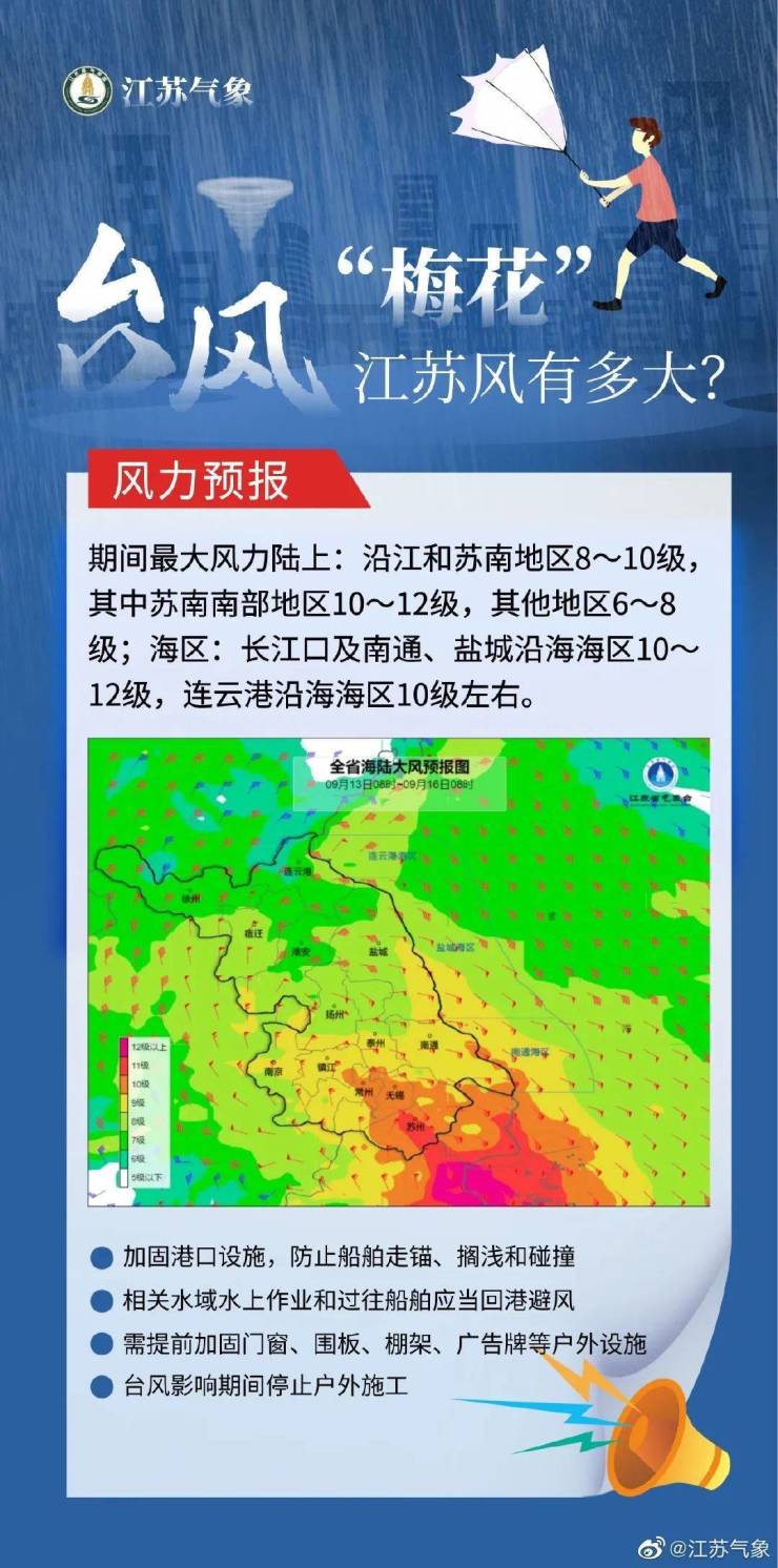 预计,“梅花”将以每小时20-25公里的速度向西北方向移动,强度维持或略有增强,即将于14日傍晚前后在浙江三门到舟山一带沿海登陆(强台风级,42-48米/秒,14-15级);登陆后,“梅花”将继续向西北方向移动,强度有所减弱,穿过杭州湾,并将于今天夜间在浙江嘉兴到上海浦东一带沿海再次登陆(台风级,35-40米/秒,12-13级)。