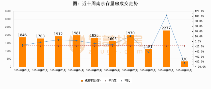 存量房方面,第40周南京存量房成交330套,较上周减少1947套,环比下降85.5%。从近十周成交走势来看,周均成交套数为1665套,本周低于平均水平80.2%。