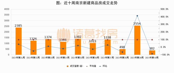 进入2024年第40周(09月30日-10月06日),南京新建商品房成交382套,较上周减少2172套,环比下降85%