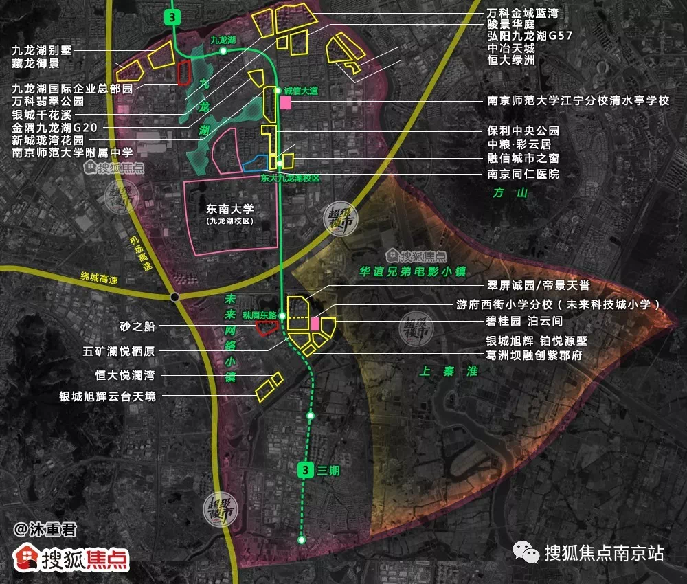 江宁九龙湖作为江宁百家湖的延伸,是江宁现如今重要的发展级。百家湖偏向于城市客厅的门户展示,注重商业的发展,而九龙湖更多的偏向于打造企业的总部基地,吸引新兴投资。而上秦淮又作为九龙湖的延伸,主打培育信息技术为主的未来网络产业,打造未来网络小镇,并且结合独特的环境优势,发展具有南京特色的旅游文化产业。