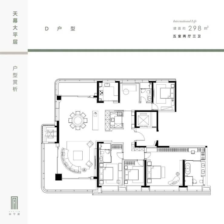 建面约298㎡户型五房两厅三卫,超大L型阳台+客餐厅一体化,别出心裁的“洄游动线”设计。家政间四周通道让整体空间联动起来,构造出了一个交通中心区域,各区域呈“岛屿状”分布。