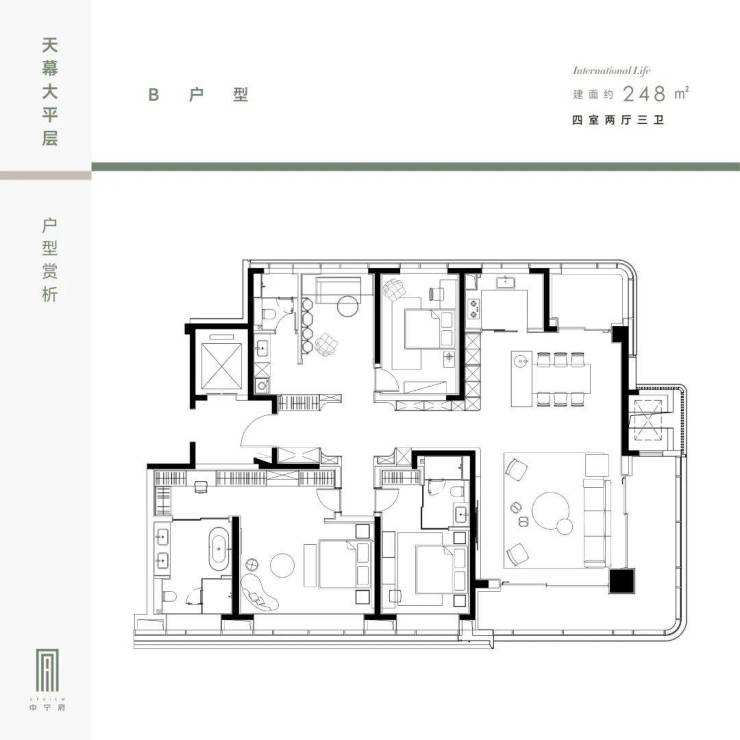建面约248㎡户型四房两厅三卫,LDKG一体化设计,270°L型宽幕阳台——景观阳台南向开间近8米、进深约2米。南向双套房设计,主卧套房设计,女王步入式衣帽间、主卫,房间开间约5.4米,主卫双台盆、浴缸;南向次卧套房带独立卫浴。