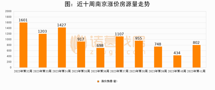 从调价房源来看,第41周南京涨价房源802套,较上周上涨84.8%。与此同时,41周涨价房源占比提升1.37个百分点,业主信心持续恢复。