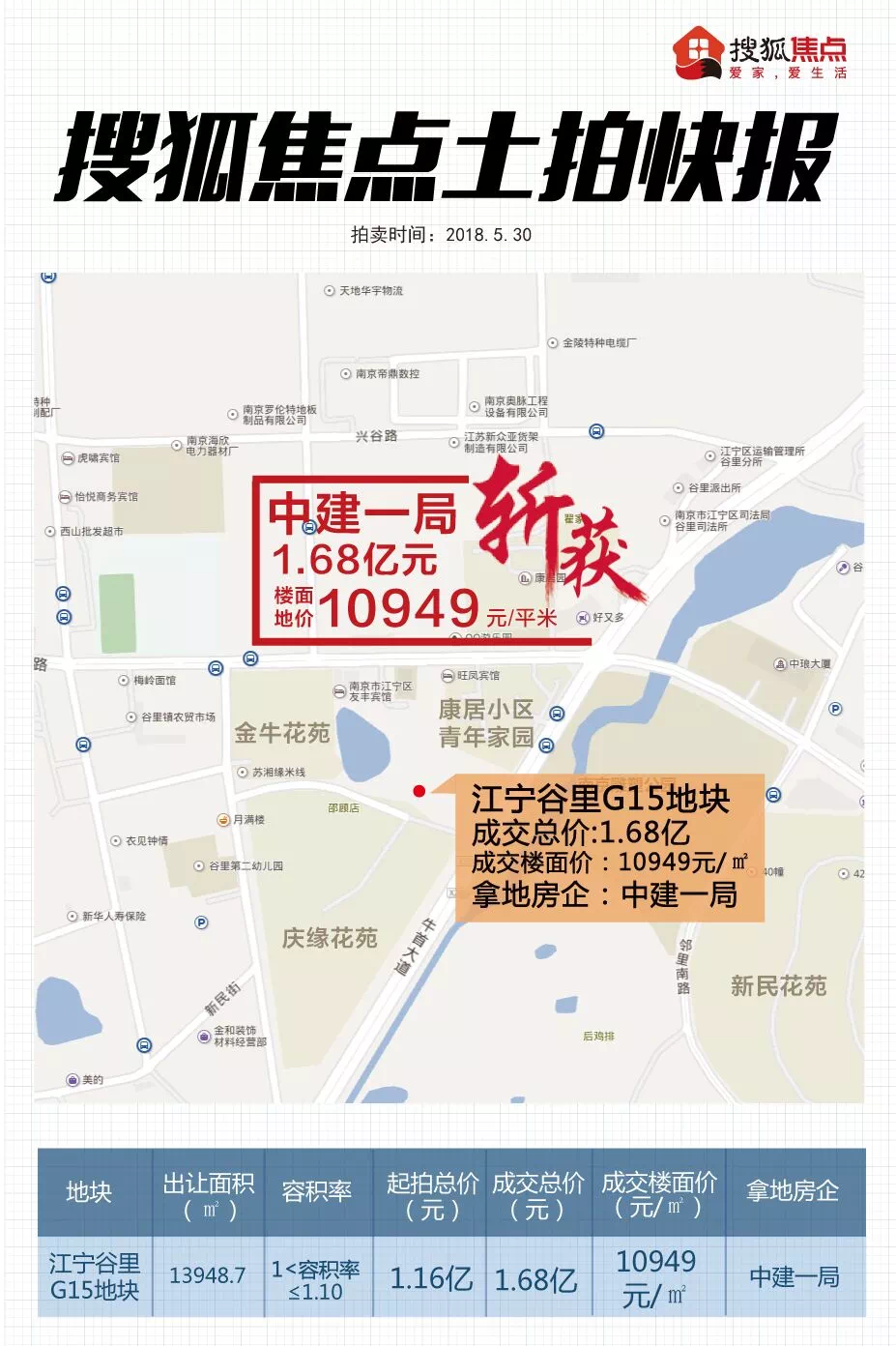 1、江宁谷里G15地块由中建一局集团房地产开发有限公司以总价1.68亿拿下,成交楼面价10949元/平米。