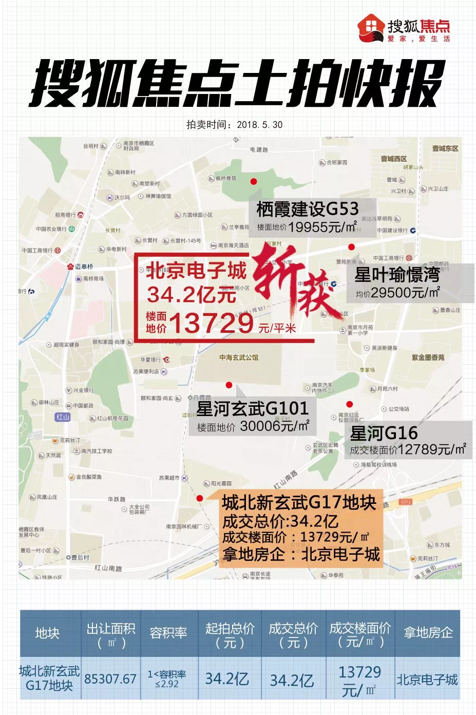 3、新玄武G17地块被北京电子城以34.2亿底价拿下,成交楼面价13729元/平。