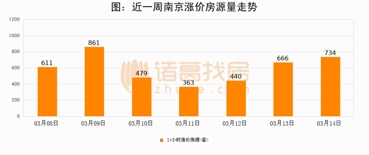 根据诸葛找房数据显示,南京24小时涨价房源量为734套,较03月13日增加68套,环比上涨10.2%。与此同时,涨价房源占比小幅扩大,业主信心有所提升。