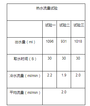 通过计时30s,对额定时长下冷、热出水量进行计量测试,再换算出热水流量,测试结果如下:
