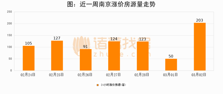 根据诸葛找房数据显示,南京24小时涨价房源量为203套,较03月01日增加153套,环比上涨306%。与此同时,涨价房源占比小幅扩大,业主信心有所提升。