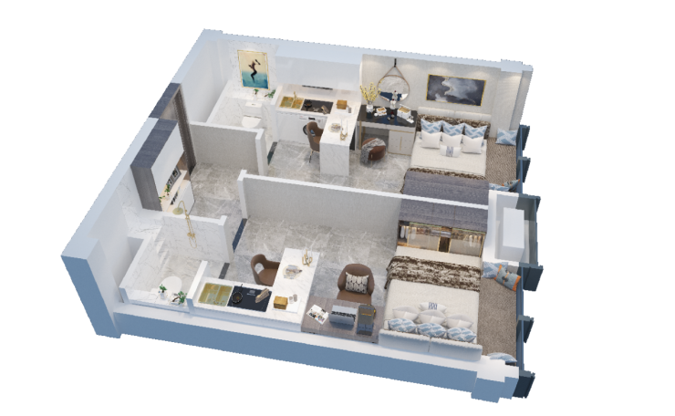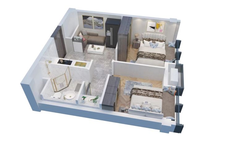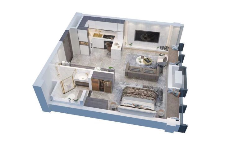 作为一室一厅使用,客厅、厨房、卧室、衣帽间、卫生间等功能区全部具备;作为两室一厅使用,同样功能齐全,还能同时放下两张床,满足不更多居住需求。