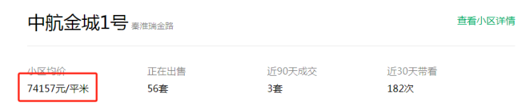 中航科技城项目的住宅部分就是大家熟悉的中航金城一号,目前小区均价高达7.4万/㎡。