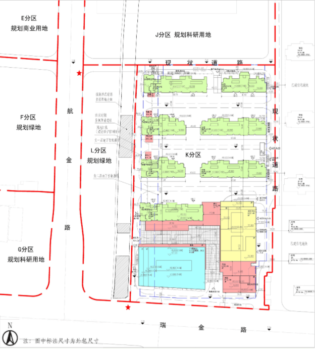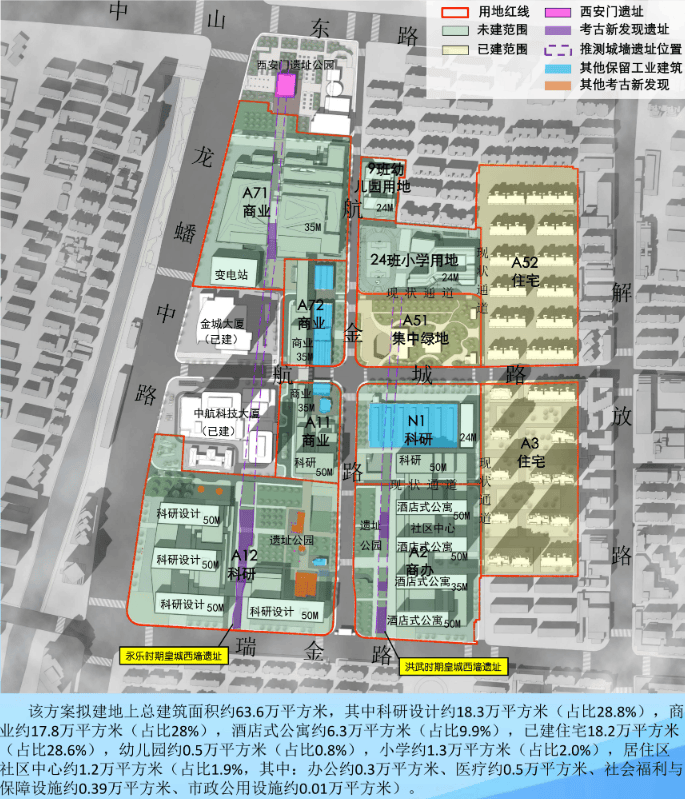 本次拟公示方案为中航科技城一航空产业城项目 (K 分区),东至现状住宅用地,南至瑞金路,北临规划科研 (B29a) 用地,西隔规划公园绿地(G1a)为航金路,规划公园绿地内存在洪武时期皇城西墙遗址,后续将结合城墙遗址进行公园绿地建设。