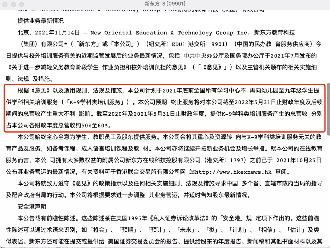 公告称,根据今年发布的《关于进一步减轻义务教育阶段学生作业负担和校外培训负担的意见》以及主管机关颁布的相关实施细则、法规 及措施。新东方计划于2021年底前全国所有学习中心不 再向幼儿园至九年级学生提供学科相关培训服务(「K-9学科类培训服务」)。