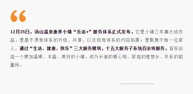 顺应“健康中国”战略需求,小镇乐活生活理念,从一开始就确立,而健康服务体系就是打开“乐活”生活的一把钥匙。汤山得天独厚的自然资源条件的优势,使得小镇具备为业主营造健康生活环境的优势。到如今,随着服务内容的逐渐完善,面向小镇家人更贴近生活、更代表未来生活与健康理念的“健康服务体系”在小镇正式落地。