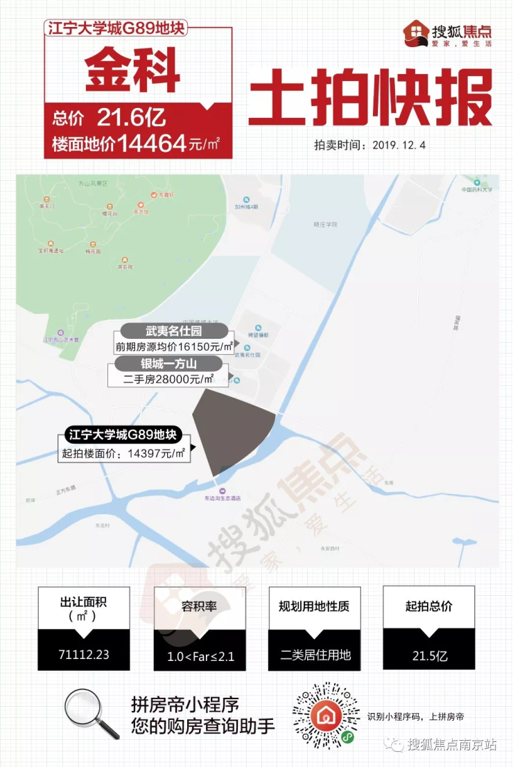 4、江宁大学城G89地块经过2轮竞价,被金科拿下,成交楼面价14464元/平。