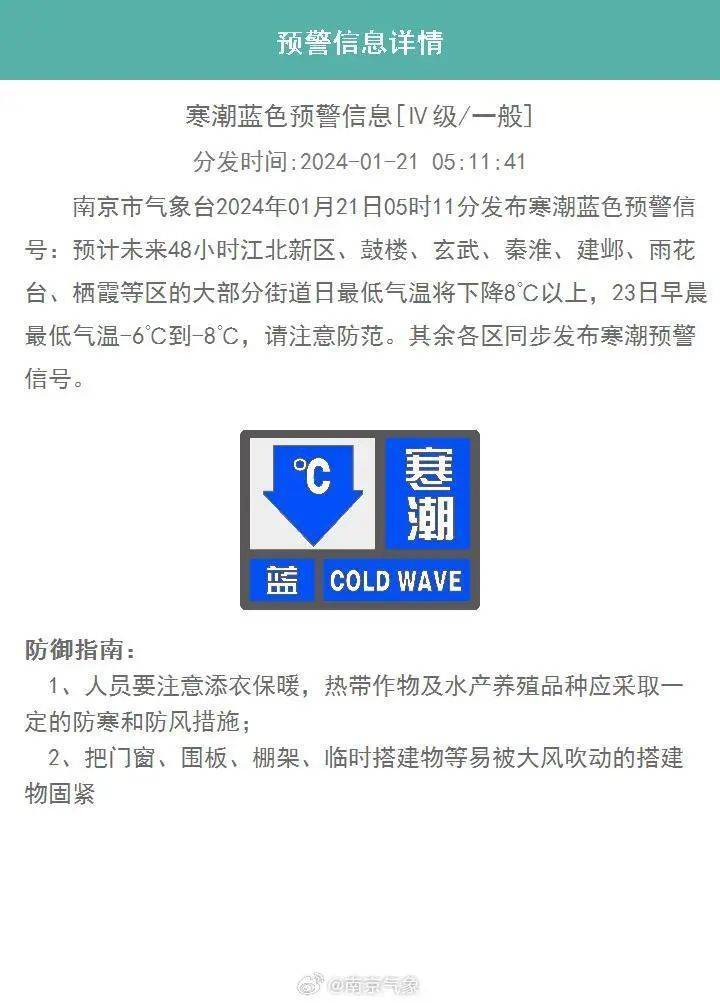 南京寒潮蓝色预警信号!请您注意防范