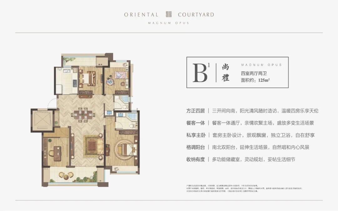 建面约125㎡为四房两厅两卫设计,餐客厅一体,连通南向双面宽阳台,构成“LDK”一体化空间,家庭成员之间的交流更方便。