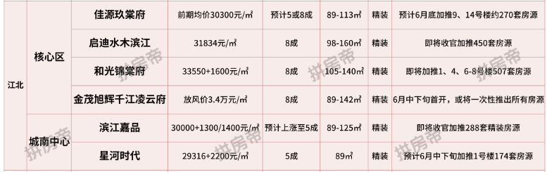 江北核心区作为供货主力,一月一次乃至半月一次的开盘潮已经见怪不怪了。此前3成的佳源玖棠府预计6月底加推9、14号楼,上次开盘远在2019年底,均价30300元/㎡,此次加推首付也大概率上涨至5-8成。启迪水木滨江即将收官加推450套房源,前均价31834元/㎡。