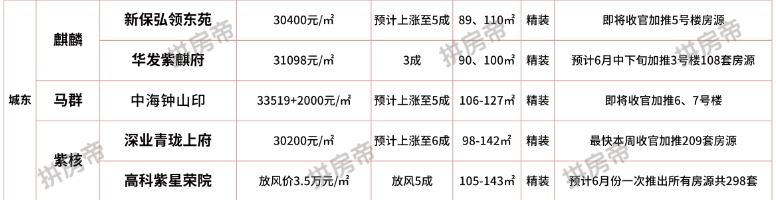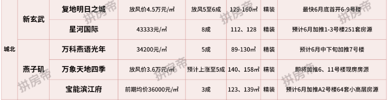 城北的新玄武一如既往的稳定,节前加推的紫金悦峯不到3小时售罄,不过复地明日之城较快6月底首开6-9号楼;星河国际即将收官加推1-3号楼251套房源,据置业顾问消息目前物价已过,精装均价44136元/㎡,无精装包,较快今天就能领到销许。
