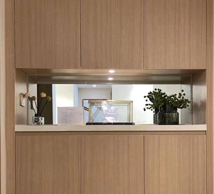 一进门就可以看到三段式入户玄关设计,收纳空间多,顶、底橱柜可充分利用,玄关底部留空,也可放置扫地机器人,满足家居收纳需求。