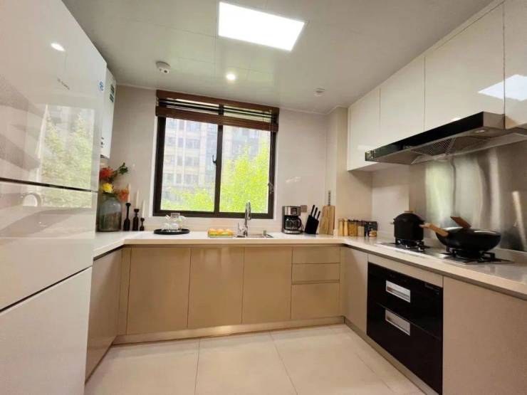 U型厨房,操作空间更大,使用更为便捷。厨卫配置齐全:品牌油烟机、定制整体橱柜,小到开关插座,抽拉式水龙头等细节都做的非常到位。