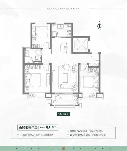这个户型做到了三开间朝南,全明通透,双卧朝阳,通风采光都很不错。餐厨客三位一体,动线开阔流畅,南向双飘窗(部分)+南向观景大阳台,观景视野很好。