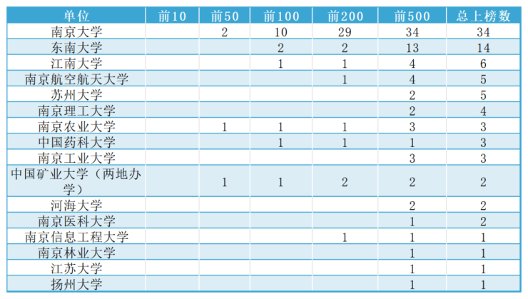 在江苏高校中,南京大学以34个学科上榜数位居第一。东南大学以14个学科上榜数位居第二,江南大学以6个学科上榜数位居第三。