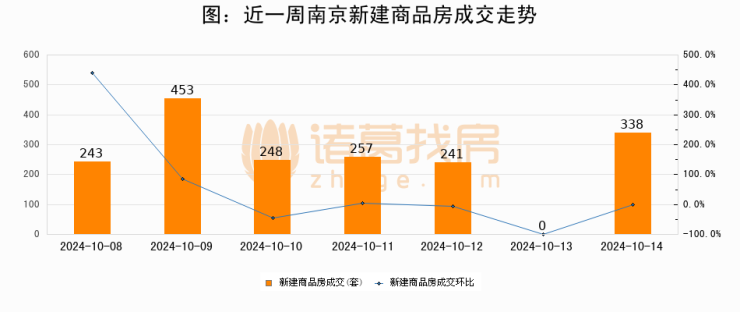 根据南京市住房保障和房产局数据显示,2024年10月14日南京新建商品房成交338套,较昨日增加338套,环比上涨0%