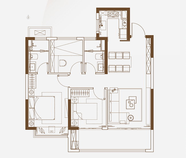 建面约116㎡户型:三房两厅两卫,南北通透,得房率约80%,两梯两户设计。客餐厅一体化、南向双阳台,连通客厅、南次卧;主卧套房设计,带独立卫浴,户型功能性齐全。