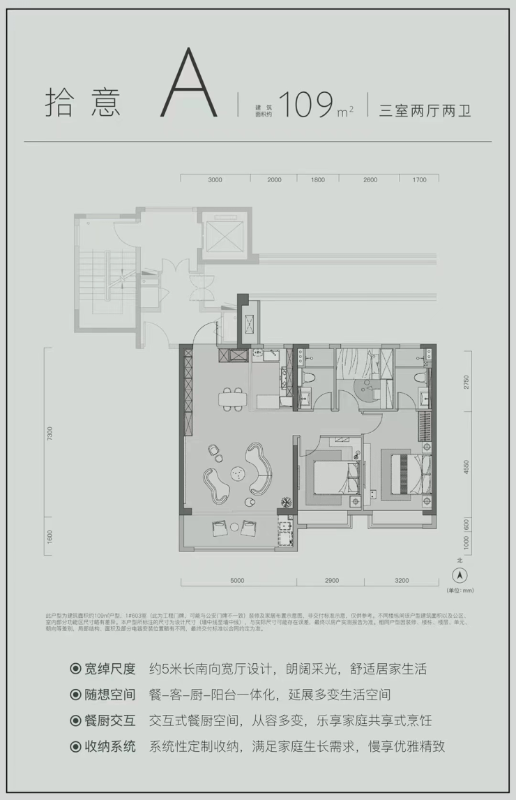 建面约109㎡户型:三室两厅两卫设计,南北通透,客厅面宽约5米,主卧套房,实用性较强。