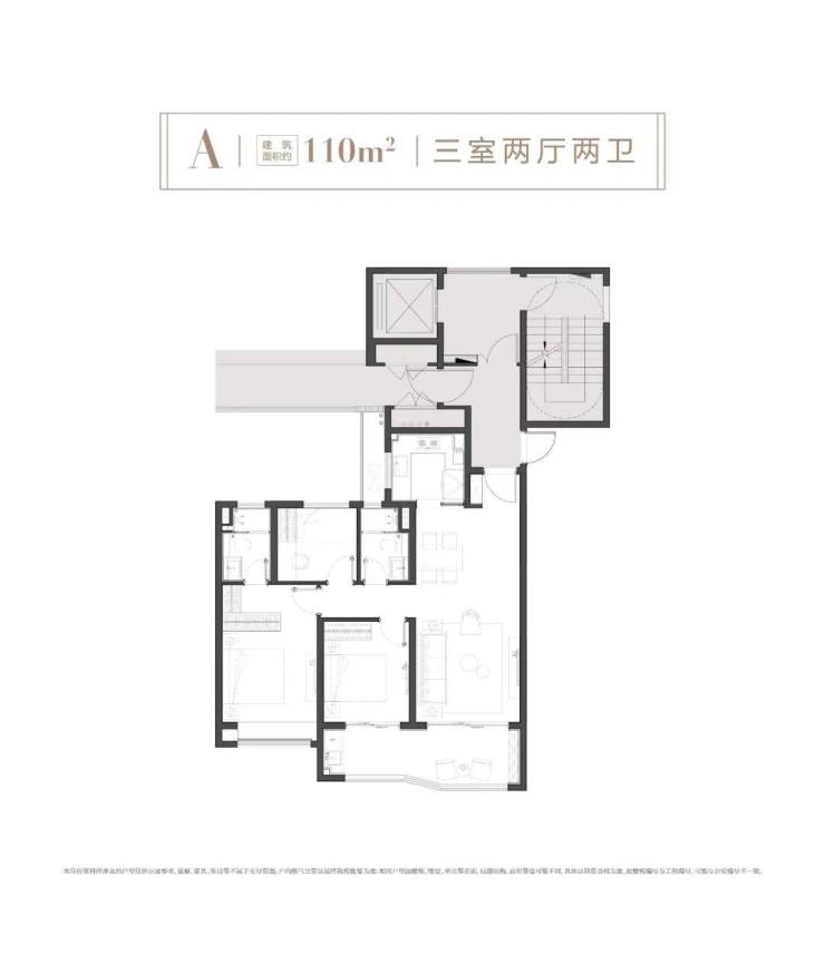 建面约100㎡户型:三房两厅两卫设计,区域难得的小户型,置业门槛较低,还做到了市面上同面积段罕见的两卫设计。约6.1米面宽的双阳台,加之大面积玻璃,采光充裕;主卧套房设计,兼具飘窗和卫浴,提升居住体验。