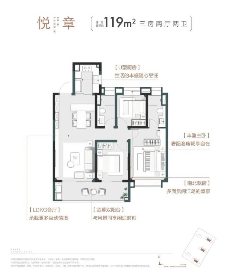 建面约119㎡户型:三房两厅两卫设计,南向三开间面宽约10.2米,约6.8米南向宽景双阳台,南北双向均带飘窗,增加空间感。