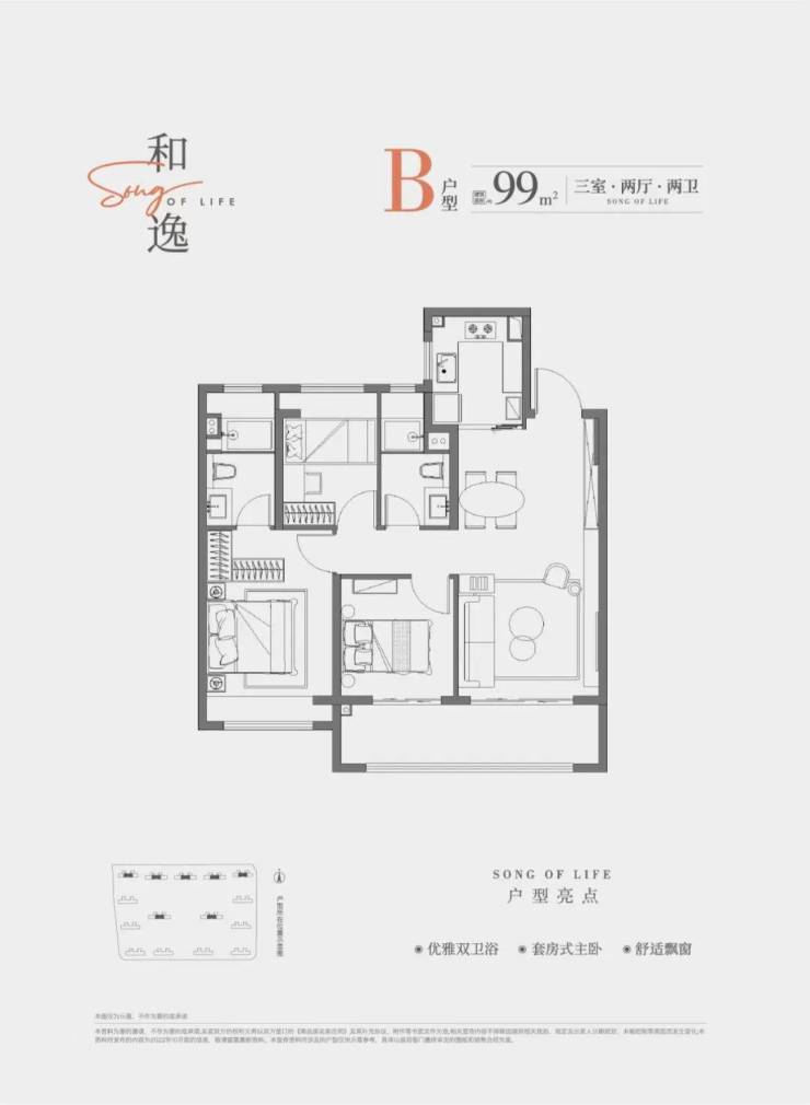 建面约99㎡户型:三室两厅两卫设计,宽阔客厅、双阳台、双卫、主卧大套间设计,非常实用,亮点十足。