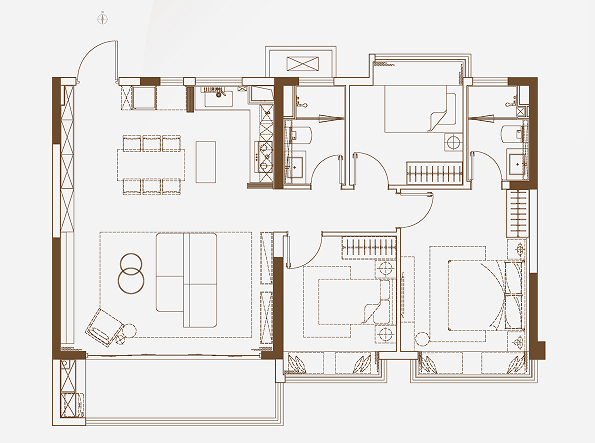 建面约110㎡三房:创新的将一半阳台进深扩展到约2米,扩大了阳台的使用空间。阳台转折处会多一面朝向,多角度光线照射,全天候采光更为充足;主卧套房达到约20㎡,居住舒适度非常高。