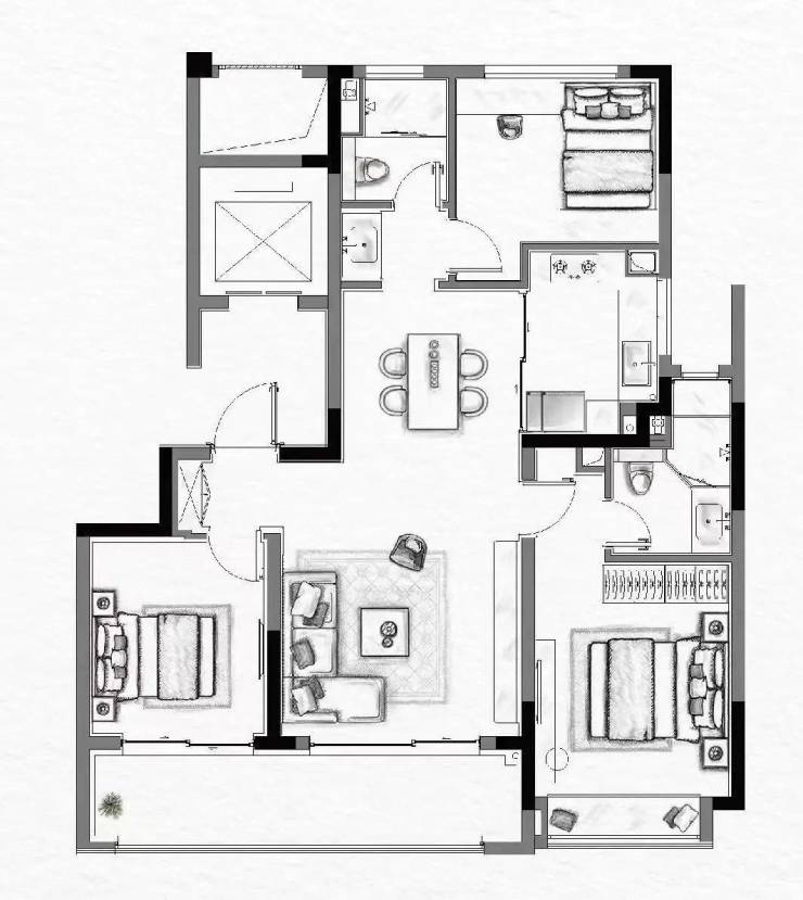 建面约118㎡户型:同样也是三房两厅两卫设计,但空间尺度有了进一步提升。餐客厅一体设计,约5.7米大面积玻璃阳台,采光充裕;主次卧均拥有270°转角飘窗,居住更为舒适,非常适合改善家庭。