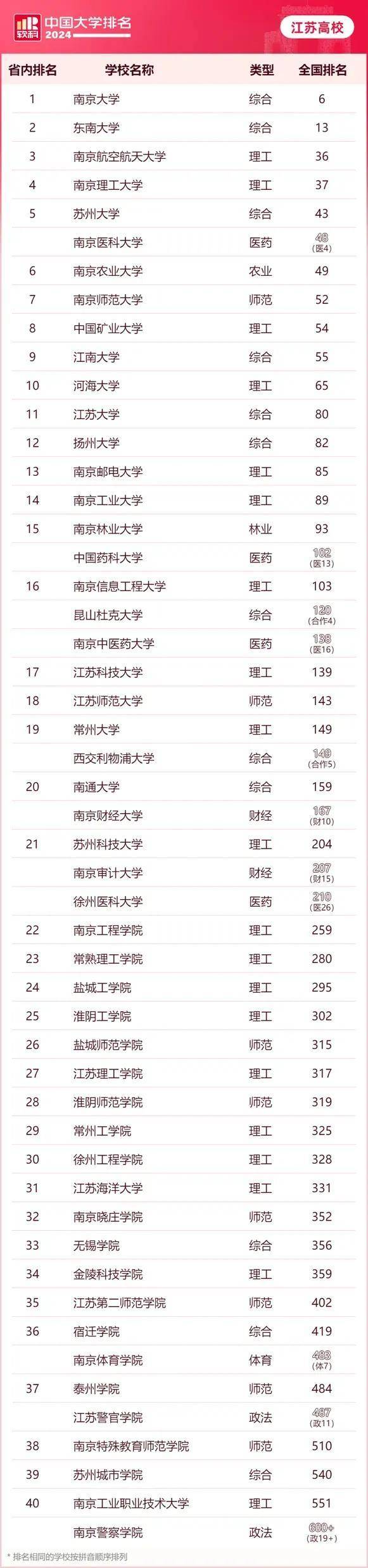南京大学(第6名)、东南大学(第13名)两所985高校以昂扬之姿,领跑全省高校;与此同时,相比2023年,东南大学在位次上取得了两名的进步。南京航空航天大学(第36名)、南京理工大学(第37名)、苏州大学(第43名)、南京农业大学(第49名)发扬自身特色,雄踞主榜50强。此外,南京师范大学(第52名)、中国矿业大学(第54名)、江南大学(第55名)、河海大学(第65名)、江苏大学(第80名)、扬州大学(第82名)、南京邮电大学(第85名)、南京工业大学(第89名)、南京林业大学(第93名)等江苏高校亦均在主榜百强之列。