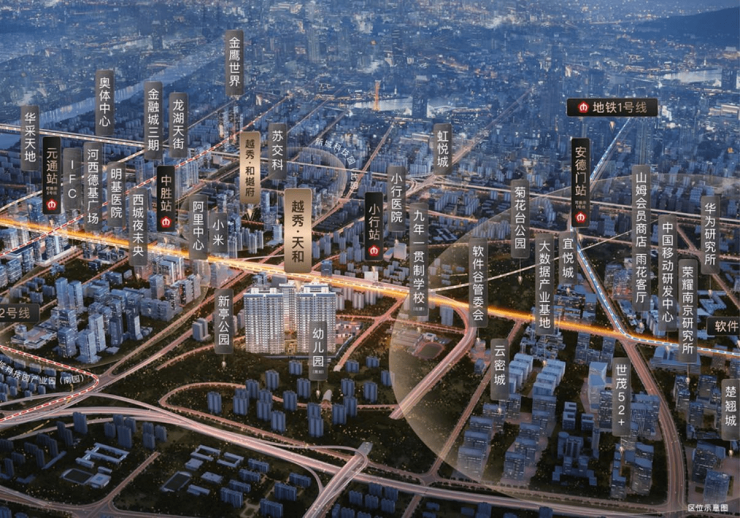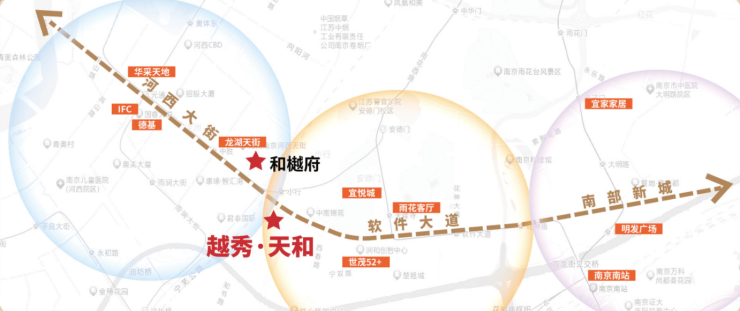 越秀·天和落子河西大道与软件大道交汇处,周边几乎包揽了南京的拳头产业与名企资源: