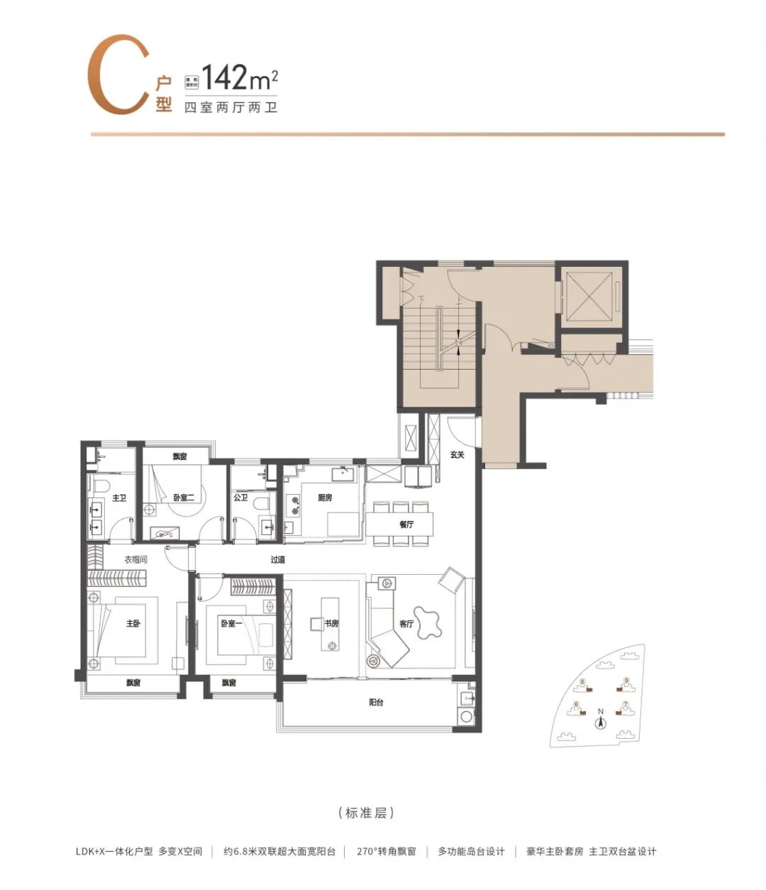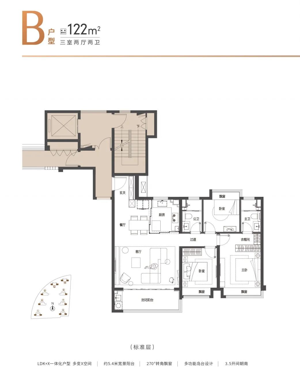 3.5开间朝南、约5.4米面宽客厅+开放式亲子互动区、开放式厨房+岛台设计,另设可改造X空间,给足家庭交流和独处场地;