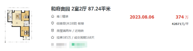 奥体的和府奥园上周成交了一套87.13平的房源,总价348万,折合单价39940元/平,而该小区在8月也成交了一套差不多面积的户型,单价42871元/平,成交价格正在进一步下探。
