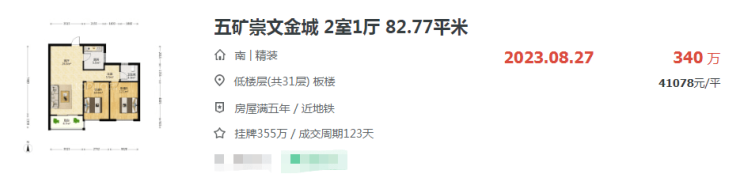 就在8月底,五矿崇文金城成交了一套82.77平的房源,总价仅有340万!折合单价4.1万/平!这也是目前小区最低成交价。