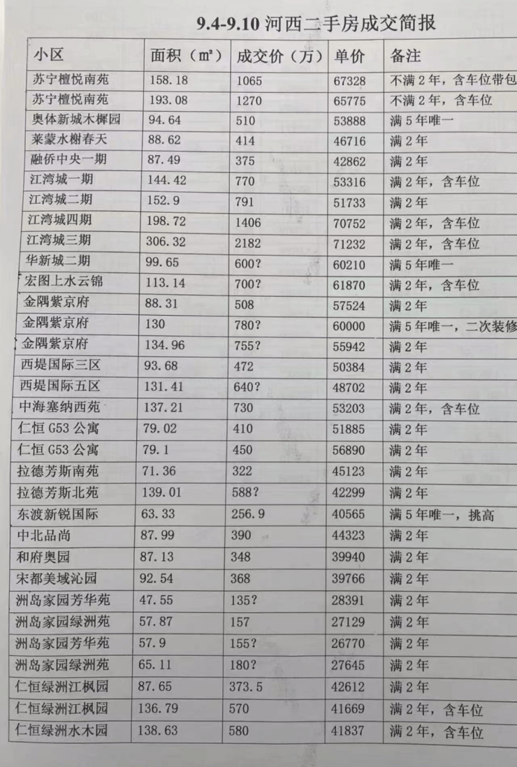 今天,一份上周(9.4-9.10)河西二手房成交简报在朋友圈流传,包括河西中、江心洲以及河西南最近的二手房成交情况。