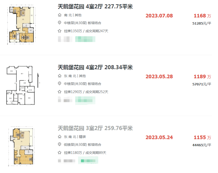 天鹅堡继今年5月卖出一套4.4万/平的房源后(该套房源低楼层+业主急售+不满两年,因此价格较低),上周卖出一套160平的房源,成交总价800万,均价49909元/平,成交价再次跌破5万/平,目前小区挂牌均价在5.5万/平左右,链家上7月最新成交价格是5.1万/平。