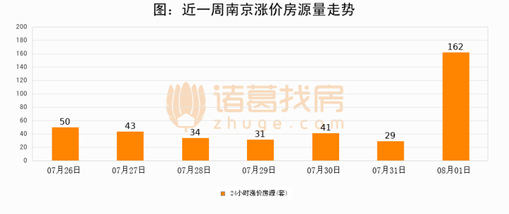 根据诸葛找房数据显示,南京24小时涨价房源量为162套,较07月31日增加133套,环比上涨458.6%。与此同时,涨价房源占比小幅扩大,业主信心有所提升。
