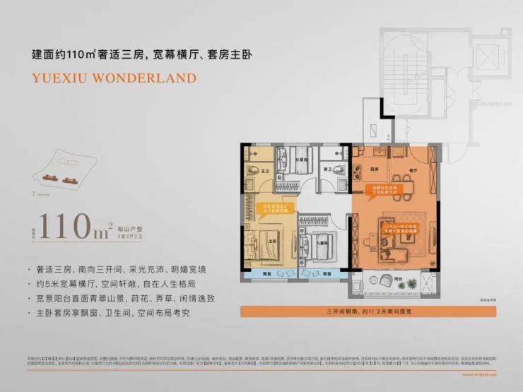 建面约110㎡户型:三开间朝南,厨房开放式+岛台设计,主卧套房设计、独立卫浴,预留衣帽间空间。
