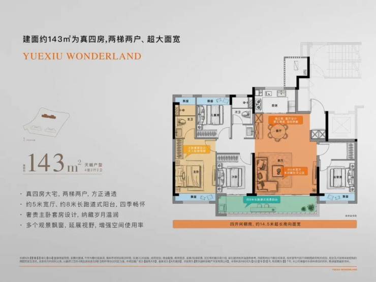 建面约143㎡户型四开间朝南,带独立储藏空间,南向双阳台开间约8米。