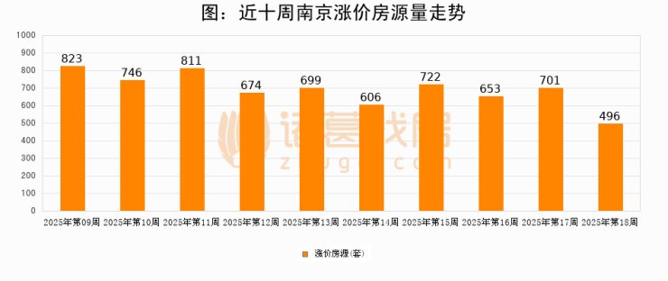 从调价房源来看,第18周南京涨价房源496套,较上周下降29.2%。与此同时,18周涨价房源占比回落0.49个百分点,业主信心小幅波动,购房者可则需入市。