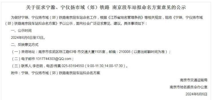 关于征求宁滁、宁仪扬市域(郊)铁路 南京段车站拟命名方案意见的公示