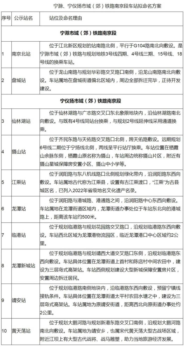 为做好宁滁、宁仪扬市域(郊)铁路南京段车站命名工作,根据《江苏省地名管理条例》等相关规定,现将《宁滁、宁仪扬市域(郊)铁路南京段车站拟命名方案》予以公示,面向社会广泛征求意见、建议。